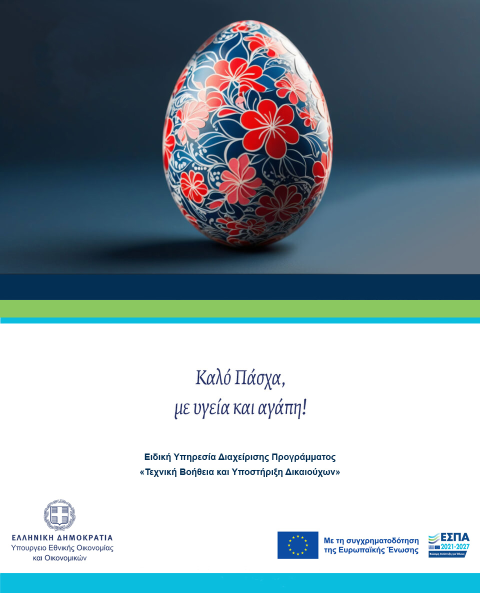 Η Ειδική Υπηρεσία Διαχείρισης Προγράμματος "Τεχνική Βοήθεια και Υποστήριξη Δικαιούχων" σας εύχεται ολόψυχα Καλό Πάσχα και Καλή Ανάσταση.